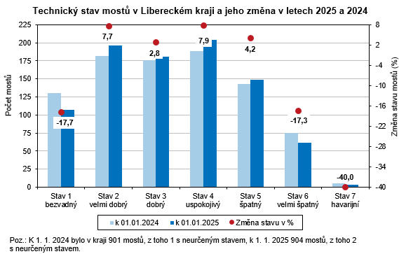 Na silnicích a dálnicích v Libereckém kraji se k 1. 1. 2025 nacházelo 904 mostů o celkové délce 15 300 metrů. Nejvíce mostů se nacházelo v okrese Liberec (375 staveb o celkové délce 7 745 metrů), nejméně v okrese Jablonec nad Nisou (110 staveb o celkové délce 1 361 metrů). V porovnání se situací k 1. 1. 2024 se počet mostů v kraji zvýšil o 3 stavby, ovšem délka jejich konstrukcí se o 167 m snížila. Meziročně více mostů bylo evidováno na silnicích v okrese Česká Lípa (+3 stavby, tj. +161 m), 1 most přibyl v okrese Liberec, ovšem celková délka mostů v tomto okrese se o 330 m snížila. Naopak o 1 most (-2 m) méně bylo evidováno na silnicích v okrese Jablonec nad Nisou. Počty těchto staveb v okrese Semily zůstaly na loňské úrovni, ovšem jejich celková délka se o 3 m rozrostla.