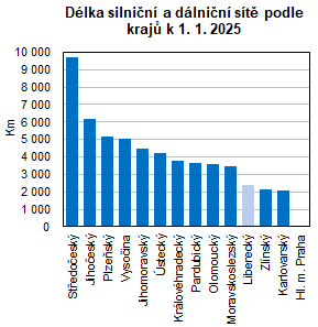 Nejdelší silniční a dálniční síť vykázal z pohledu ostatních regionů Středočeský kraj (9 678 km, tj. 17,3 % z republikového úhrnu), následovaný krajem Jihočeským s délkou 6 192 km a 11,1% podílem. Liberecký kraj se v tomto srovnání umístil na 4. nejnižší pozici. Nejkratší síť silnic a dálnic evidovalo hlavní město Praha (80 km, 0,1 %) a poté Karlovarský kraj (2 056 km, 3,7 %).