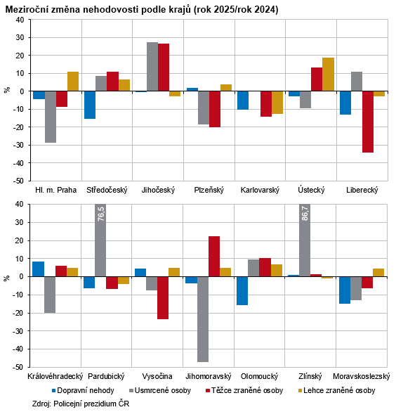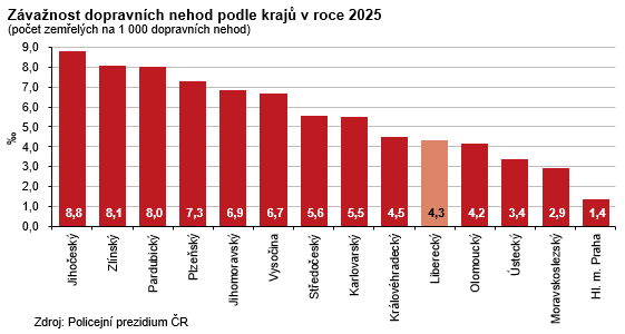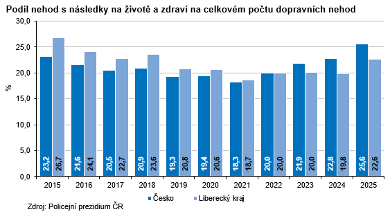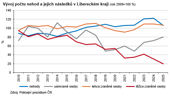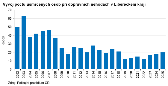V roce 2025 přišlo o život na silnicích v celém Česku 421 osob, což je o 17 osob méně než v roce předchozím a historicky nejméně od 60. let minulého století. V našem kraji zahynulo 20 osob (meziročně o 2 osoby a 11,1 % více), stejně jako v Královéhradeckém regionu, a v rámci krajů se jedná o 3. nejnižší počet usmrcených osob. Nejvíce osob bylo usmrceno při nehodách osobních aut (9 osob), dále zahynuli 4 motorkáři, 4 chodci, 2 osoby v nákladním autě a 1 cyklista. Podle okresů našeho kraje nejvíce osob zemřelo na území okresu Liberec (9 osob), na Českolipsku a Semilsku skonalo po 4 osobách, v okrese Jablonec nad Nisou 3 osoby. Mezi kraji nejméně úmrtí v důsledku dopravních nehod evidoval Karlovarský kraj (13 osob), naopak na silnicích ve Středo-českém kraji bylo usmrceno 77 osob, s odstupem pak následuje Jihočeský kraj se 42 zemřelými. V relativním vyjádření nejvýraznější nárůst usmrcených osob zaznamenaly kraje Zlínský a Pardubický (+86,7 %, resp. 76,5 %), naopak největší pokles vykázal Jihomoravský kraj (-47,2 %). K nejtragičtějším měsícům v Česku i v Libereckém kraji patřily shodně září (57 zemřelých, resp. 5 zemřelých) a srpen (53 zemřelých, resp. 4 zemřelí).