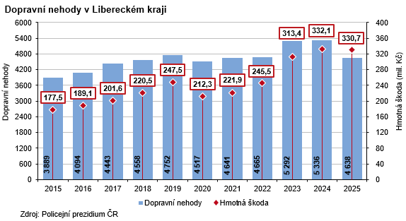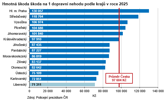 Hmotné škody způsobené při dopravních nehodách v roce 2025 v Libereckém kraji dosáhly částky 330,7 mil. Kč, meziročně méně o 1,3 mil. Kč (-0,4 %). Meziroční pokles zaznamenaly také další 4 kraje (Zlínský, Jihočeský, Moravskoslezský a nejvýraznější ve výši 14,0 % Olomoucký). Nárůst v rámci celé republiky dosáhl 4,4 % a z krajů nejvýrazněji hmotná škoda vzrostla v Jiho-moravském kraji (+20,0 %). Na jednu dopravní nehodu v Libereckém kraji v průměru připadla škoda ve výši 71 311 Kč, což je v porovnání s ostatními regiony nejnižší částka. Na opačném konci pomyslného žebříčku se umístilo hlavní město Praha (130 057 Kč).