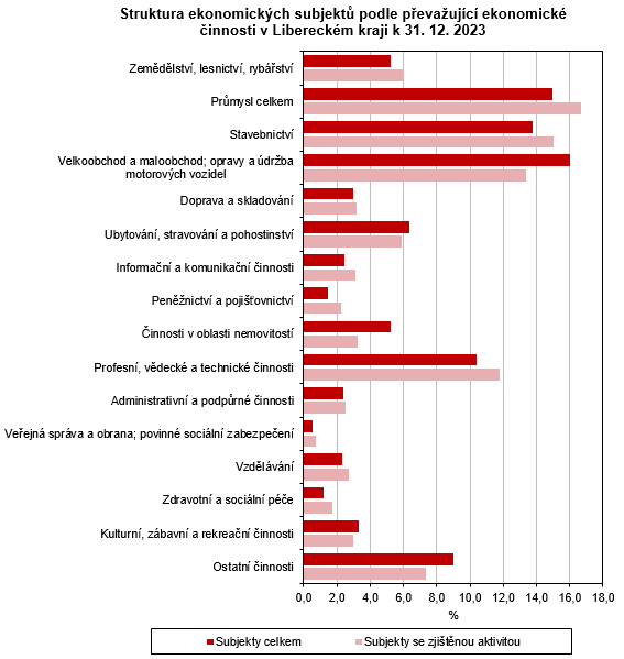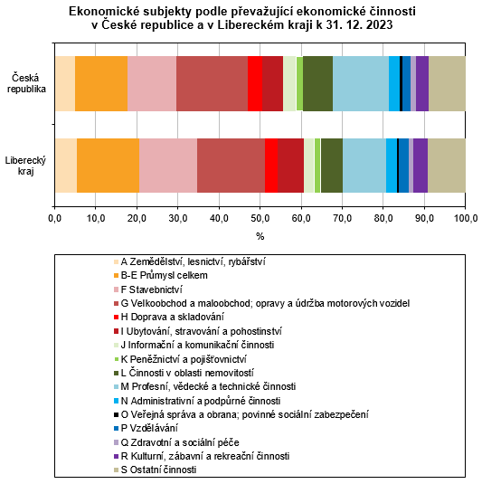 V České republice bylo ke konci roku 2023 vedeno více než 2,8 mil. ekonomických subjektů, jejich celkový počet meziročně poklesl o 6,6 %. V Libereckém kraji bylo zapsáno 105 303 subjektů, u 56,9 % subjektů byla zjištěna aktivita v rámci statistických zjišťování nebo z administrativních zdrojů. Počet ekonomických subjektů meziročně poměrně výrazně poklesl, a to o 9,0 % (−10 473 jednotek). Meziročně méně ekonomických subjektů však zaznamenaly všechny kraje, největší pokles byl vykázán ve Zlínském kraji (-9,8 %), nejméně se počet subjektů změnil v hlavním městě Praze (-2,2 %). Pokles za Liberecký kraj byl 4. nejvyšší. Nejvyšší zastoupení měly ekonomické subjekty v hlavním městě Praze, tj. 23,4 % (655 855 jednotek) celorepublikového počtu. S 12,1% podílem následoval kraj Středočeský a s 11,3 % kraj Jihomoravský. Subjekty evidované na území Libereckého kraje představovaly 3,8 % republikového úhrnu – po Karlovarském kraji (2,4 %) a společně s Krajem Vysočinou 2. nejnižší podíl.