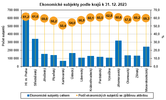 V rámci České republiky tvořily ke konci roku 2023 fyzické osoby 70,3 % a právnické osoby 29,7 % celkového počtu ekonomických subjektů. Meziročně se pak počet fyzických osob snížil o 9,7 %, naopak počet právnických osob byl proti roku 2022 mírně vyšší, a to o 1,7 %