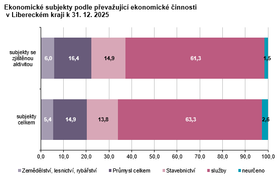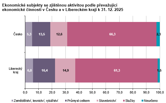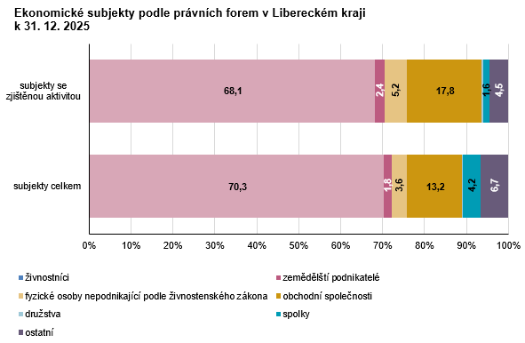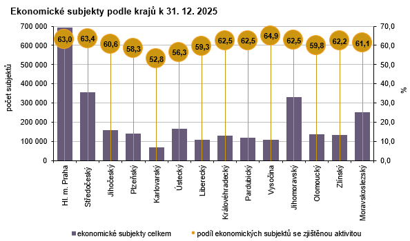 V Česku bylo ke konci roku 2025 vedeno více než 2,8 mil. ekonomických subjektů, jejich celkový počet meziročně vzrostl o 2,0 %. V Libereckém kraji bylo zapsáno 106 209 subjektů, u 59,3 % subjektů byla zjištěna aktivita v rámci statistických zjišťování nebo z administrativních zdrojů. Počet ekonomických subjektů v našem kraji se meziročně mírně navýšil, a to o 0,7 % (+732 jednotek). Počet ekonomických subjektů se proti roku 2024 zvýšil také ve všech ostatních krajích. Přírůstek se pohyboval v rozmezí od +0,6 % v Královéhradeckém kraji do +3,0 % v hlavním městě Praze. Nejvyšší zastoupení měly ekonomické subjekty nadále v hlavním městě Praze – 692 397 jednotek představovalo 23,9 % celorepublikového počtu. S 12,2% podílem následoval kraj Středočeský a s 11,4 % kraj Jihomoravský. Subjekty evidované na území Libereckého kraje představovaly 3,7 % republikového úhrnu, tj. po Karlovarském kraji (2,4 %) 2. nejnižší podíl.