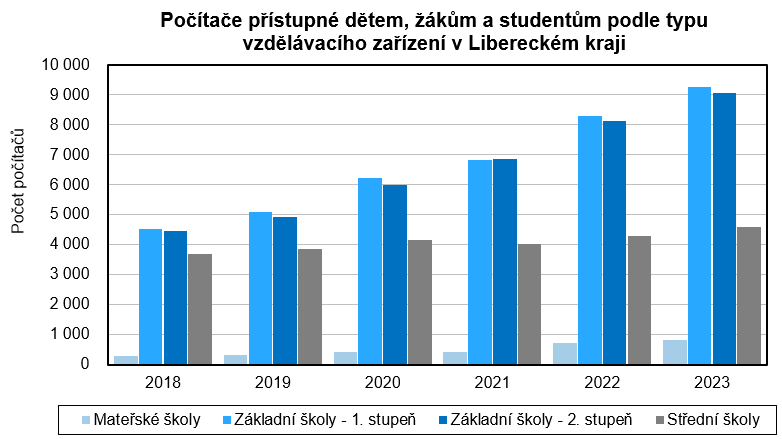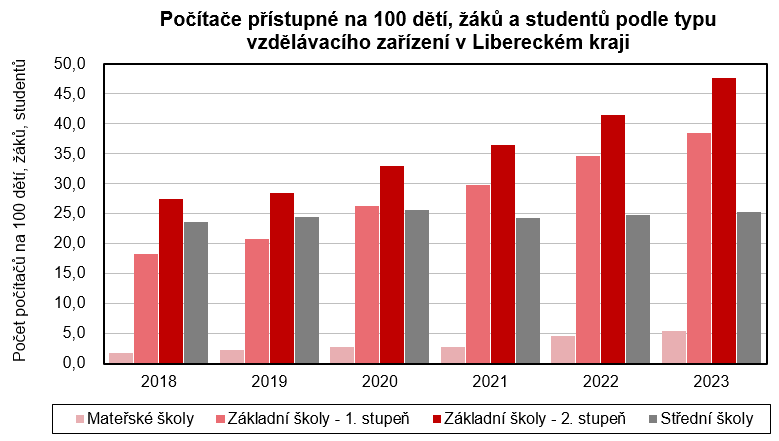 Možnost přístupu žáků i pedagogů k digitálním technologiím se ve školách na území Libereckého kraje během posledních let změnila. Na všech typech vzdělávacích zařízení v posledních 6 letech sleduje pravidelný nárůst počtu počítačů přístupných dětem. V porovnání s rokem 2019, tedy rokem před pandemií onemocnění covid-19 a zavedením online výuky z domova, vzrostl počet počítačů přístupných dětem v případě mateřských škol téměř 2,5násobně (tj. z 338 počítačů v roce 2019 na 841 počítačů v roce 2023). Nárůst na prvním a druhém stupni základních škol byl srovnatelný a činil zhruba 83 %. Nejméně výrazné zvýšení počtu počítačů bylo vykázáno u studentů na středních školách, a to +19,3 %.