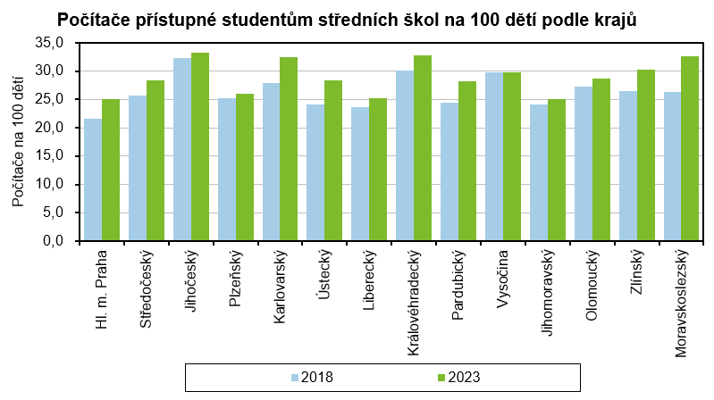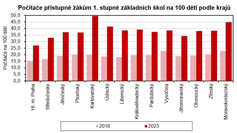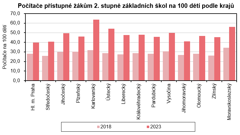 V přepočtu na 100 žáků na tom v roce 2023 v Libereckém kraji byli nejlépe žáci 2. stupně základních škol, kteří měli v průměru k dispozici 47,7 počítačů. Celorepublikový průměr dosáhl 46,7 počítačů, v rámci krajů se pak hodnota pohybovala v rozmezí od 39,6 počítačů v hlavním městě Praze do 63,8 počítačů v Karlovarském kraji. Náš region obsadil 7. nejvyšší příčku. Na 1. stupni základních škol Libereckého kraje na 100 žáků připadlo 38,4 počítačů. Nejvyšší hodnoty ukazatel nabyl v Karlovarském kraji (49,6 počítačů na 100 dětí), nejnižší v hlavním městě Praze (27,1 počítačů), Liberecký kraj v tomto srovnání obsadil 5. nejvyšší příčku. U studentů středních škol v kraji dosáhla hodnota ukazatele 25,3 počítačů. V rámci regionů se ukazatel pohyboval mezi 25,0 počítači v Jihomoravském a 33,2 počítači v Jihočeském kraji a v tomto srovnání se náš kraj umístil na 3. nejnižší pozici. V případě mateřských škol pak na 100 dětí připadlo 5,5 počítače.