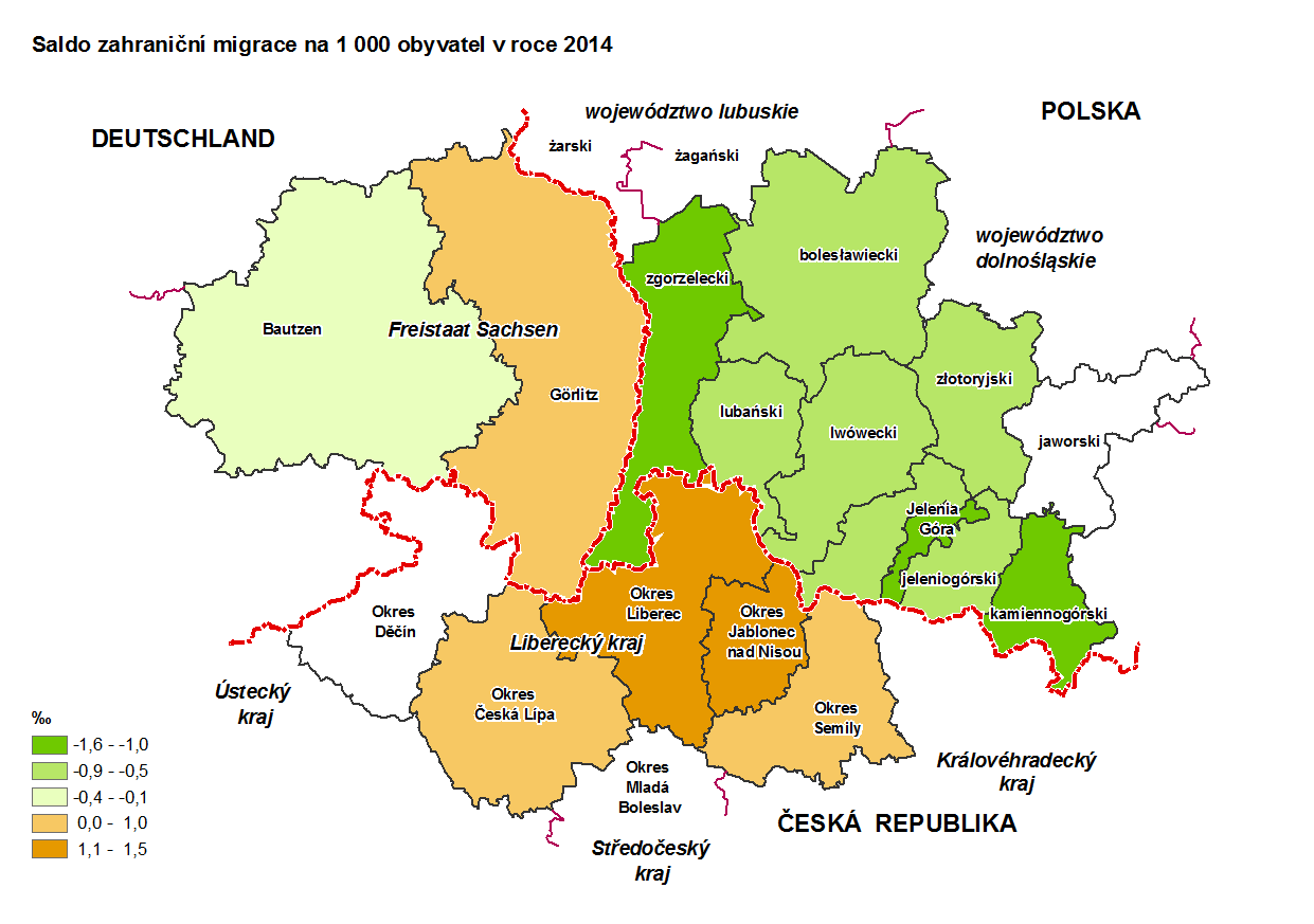 Saldo zahraniční migrace na 1 000 obyvatel v roce 2014