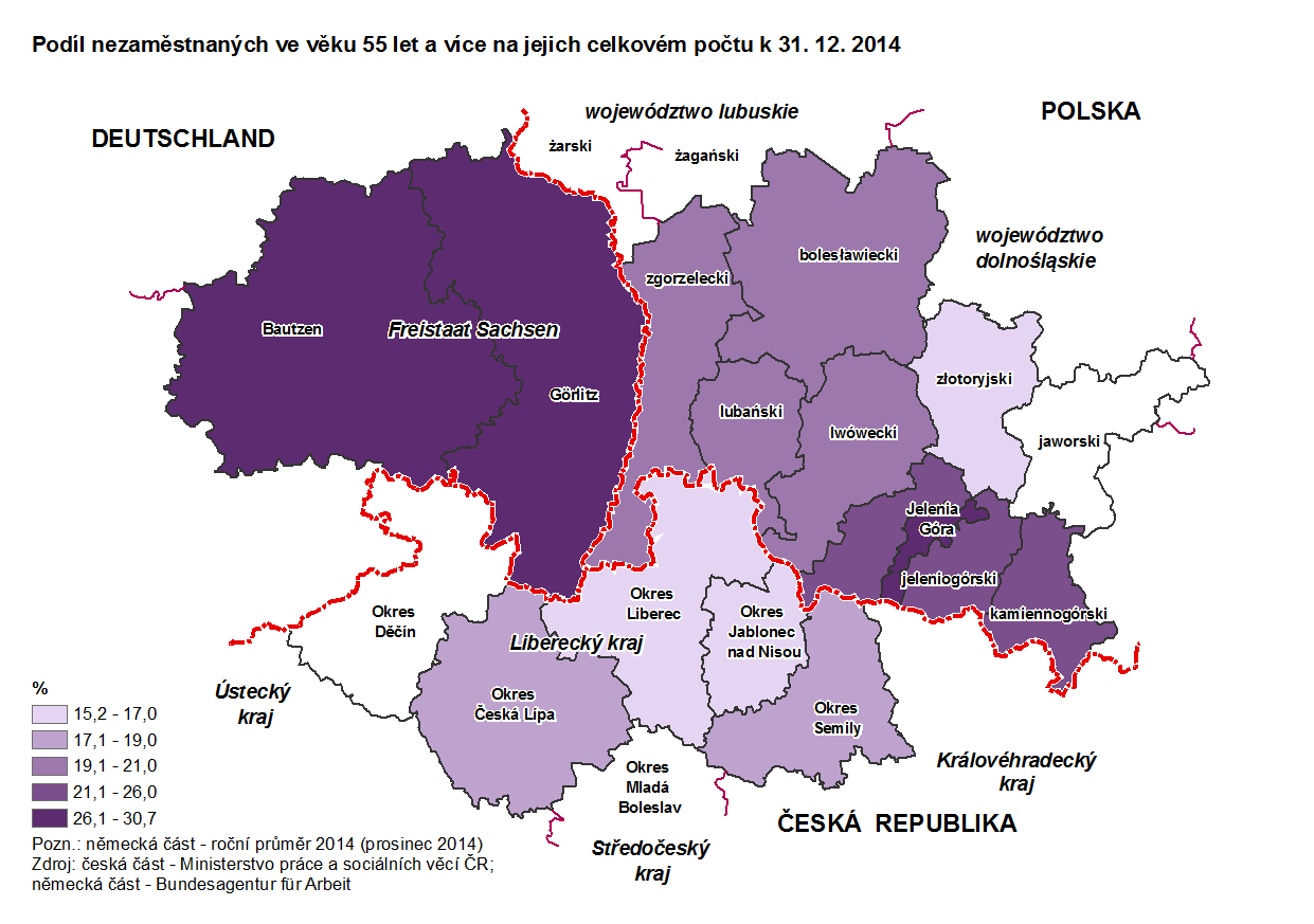 Podíl nezaměstnaných ve věku 55 let a více na jejich celkovém počtu k 31. 12. 2014