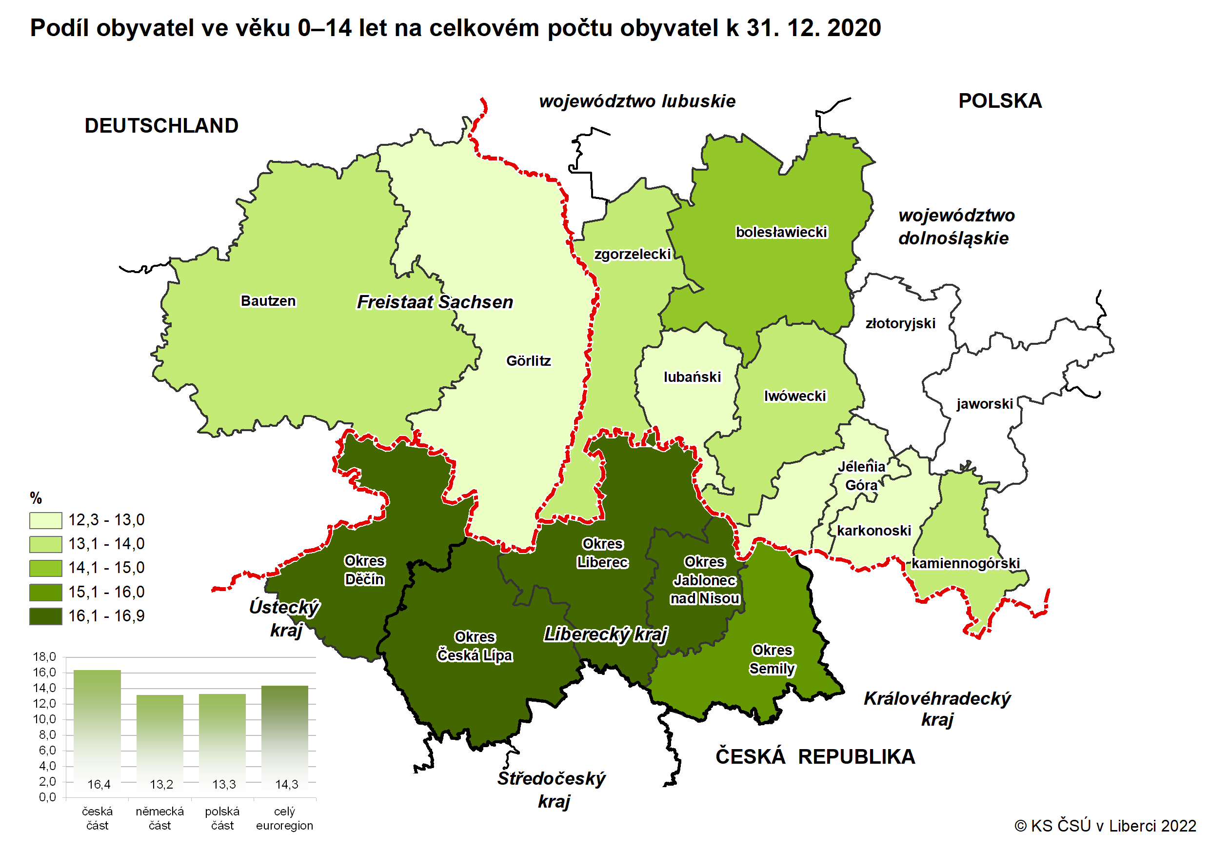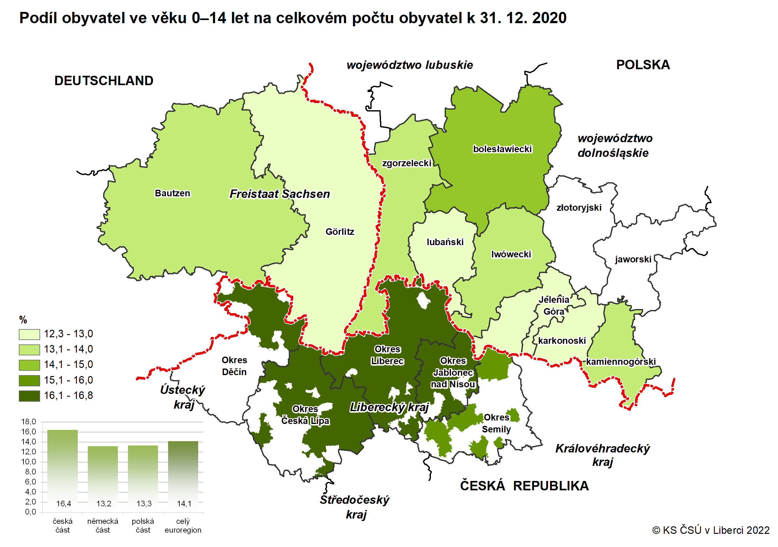 Podíl obyvatel ve věku 0–14 let na celkovém počtu obyvatel k 31. 12. 2020