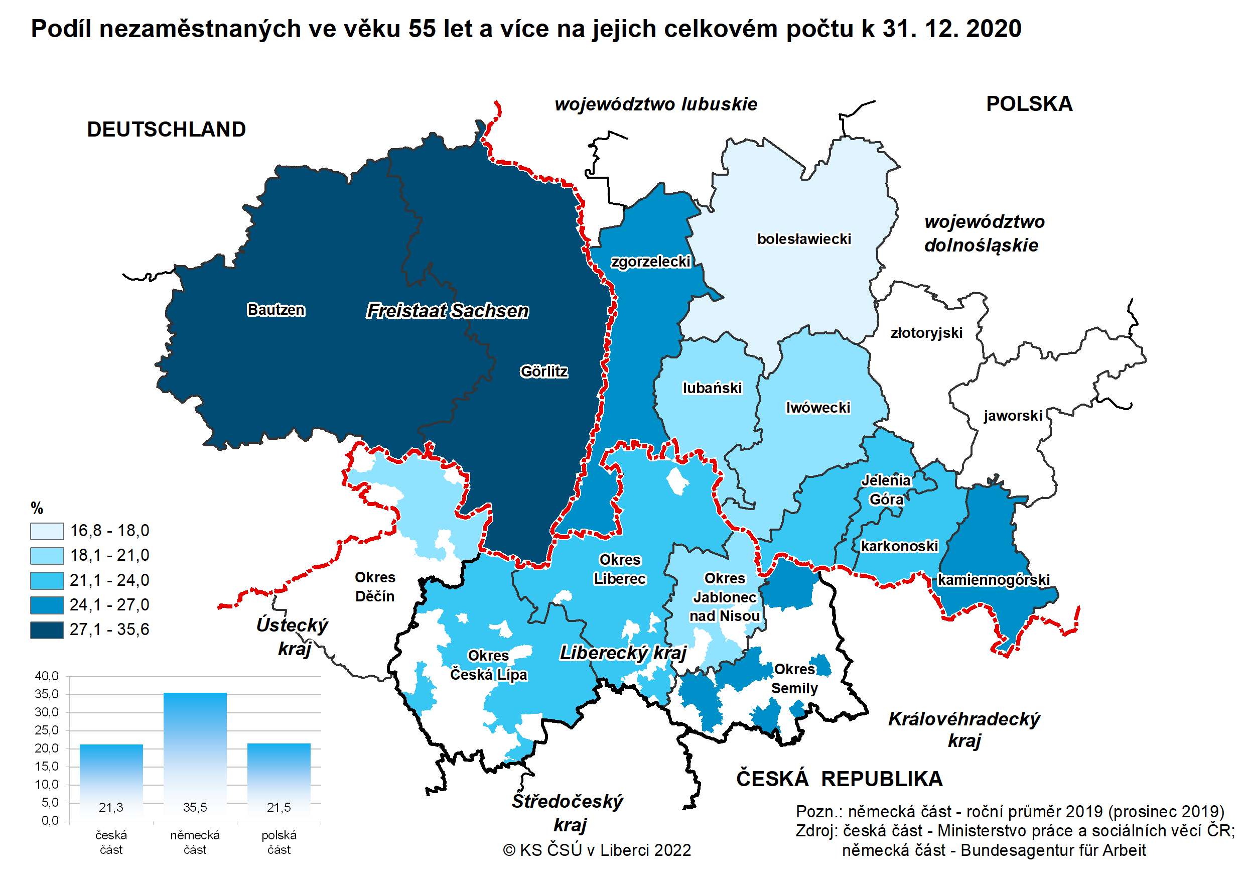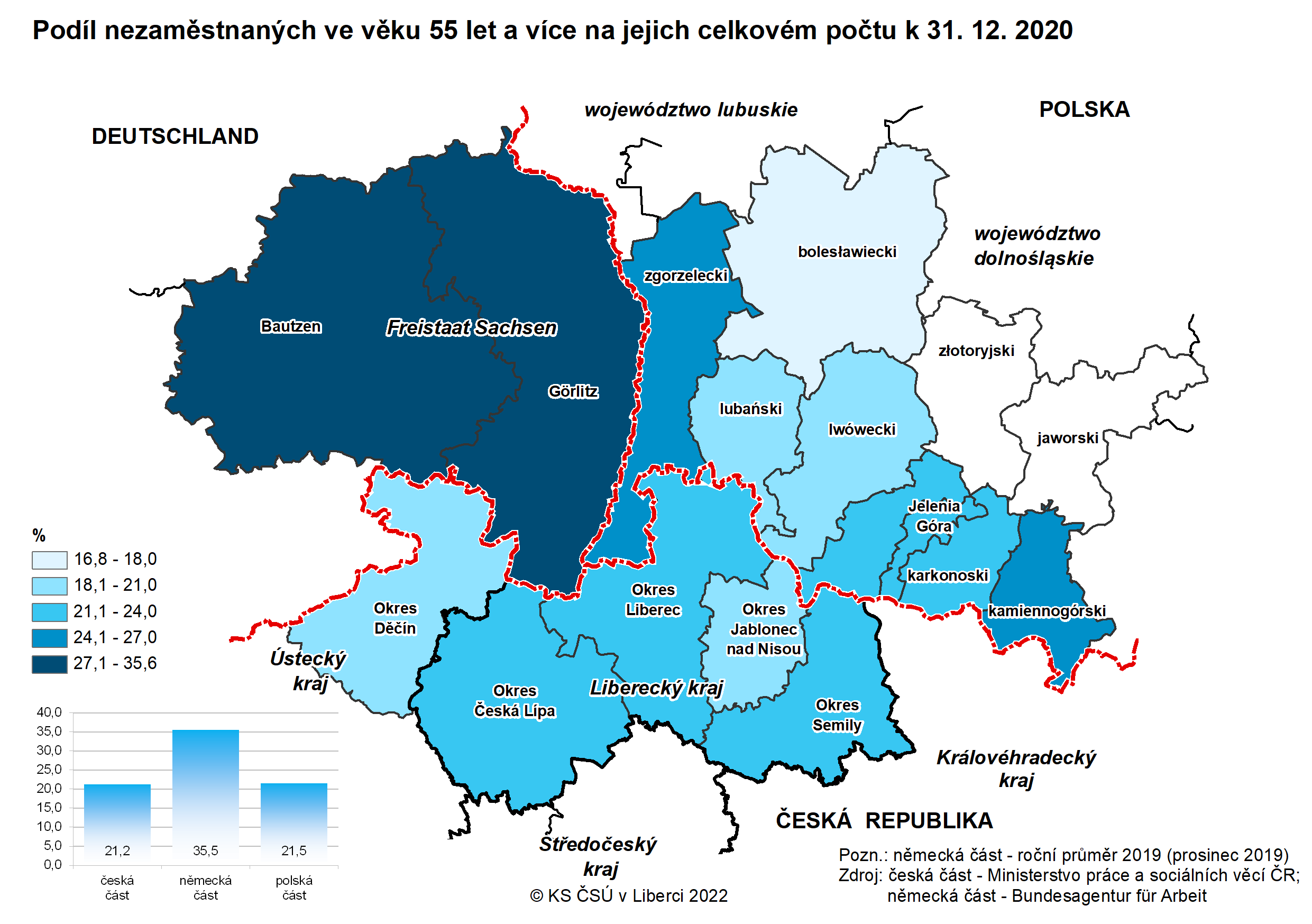 Podíl nezaměstnaných ve věku 55 let a více na jejich celkovém počtu k 31. 12. 2020