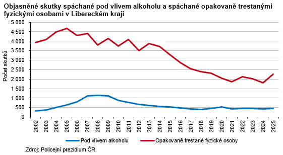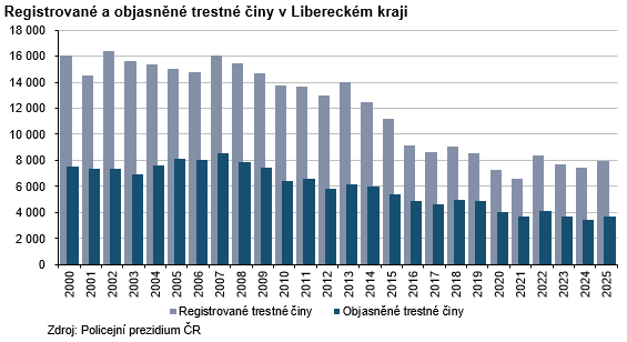 V Libereckém kraji bylo v roce 2025 Policií ČR registrováno celkem 7 924 trestných činů, tj. o 6,7 % (498 skutků) více než v předcházejícím roce. V rámci obecné kriminality bylo zaznamenáno 6 367 trestných činů (80,4 % celkové kriminality), meziročně o 10,1 % více. Trestné činy spadající do kategorie hospodářské kriminality tvořily 7,0 % všech registrovaných trestných činů a při srovnání s rokem 2024 se jejich počet zvýšil o 3,4 % na 554 skutků. Zbývající kriminalita představovala 12,7 % registrovaných činů (1 003 činů) a klesla o 105 případů (-9,5 %).