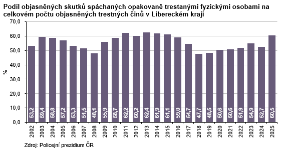 V roce 2025 bylo v Libereckém kraji objasněno 3 723 registrovaných trestných skutků, tj. 47,0 %. V případě obecné kriminality bylo objasněno 2 791 činů (43,8 %), v případě hospodářské kriminality 225 skutků (40,6 %). Podařilo se dopadnout pachatele 4 vražd. Z celkového počtu objasněných trestných skutků bylo 2 252 činů (60,5 %) spácháno opakovaně trestanými fyzickými osobami, 383 činů bylo spácháno cizinci a 106 činů dětmi do 17 let. Z předchozích let se podařilo policii objasnit dalších 905 trestných činů, včetně 1 zbývající vraždy z roku 2024.