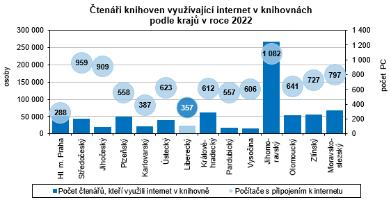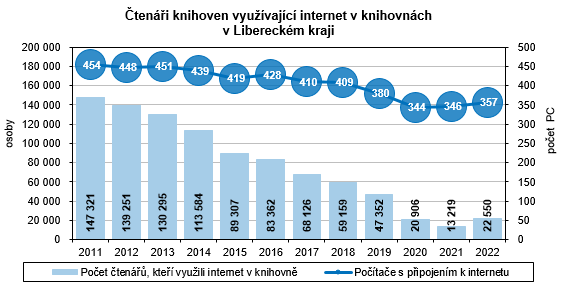 V rámci knihoven jsou návštěvníkům k dispozici také počítače – v Libereckém kraji bylo v roce 2022 k tomuto účelu určeno 357 počítačů. Internet v knihovně v roce 2022 v našem regionu využilo 22 550 čtenářů, tj. po výrazném poklesu v roce 2021 meziročně o 70,6 % více.