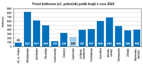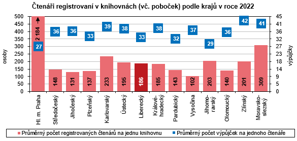V přepočtu na jednu knihovnu (včetně poboček) v našem kraji ve sledovaném roce připadlo 186 čtenářů, meziročně o 21 čtenářů více. V rámci mezikrajského srovnání bylo nejvíce čtenářů na jednu knihovnu v regionu evidováno v hlavním městě Praze (2 184 osob), naopak tomu bylo v Kraji Vysočina (102 osob). Libereckému kraji náležela 7. nejvyšší příčka. Nejvíce knihoven včetně poboček se v roce 2022 nacházelo ve Středočeském kraji (823 zařízení), nejvíce registrovaných čtenářů pak vykázalo hlavní město Praha (194 393 osob).