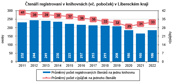 Ke konci roku 2022 fungovalo v Libereckém kraji 198 veřejných knihoven a 31 jejich poboček, ve kterých bylo zaregistrováno celkem 42 613 čtenářů. Ve srovnání s rokem 2021 přibyla 1 knihovna, počet poboček se nezměnil, počet čtenářů zaznamenal 13,0% nárůst. Po propadu v roce 2021 výrazněji vzrostl počet mladých čtenářů do 15 let (+28,4 %).