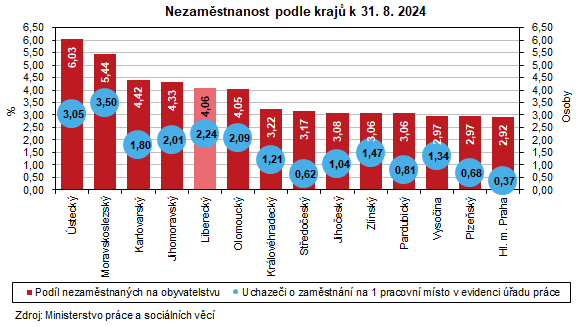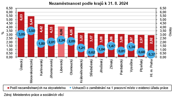 K 31. srpnu 2024 dosáhl podíl nezaměstnaných v Libereckém kraji 4,06 %, tj. ve srovnání s hodnotou k 31. červenci 2024 o 0,03 procentních bodů (p. b.) více. Ve srovnání s hodnotou ze srpna 2023 byl letošní podíl vyšší o 0,32 p. b. Z pohledu pohlaví se nezaměstnanost zvýšila pouze u žen (+0,06 p. b. na 4,64 %), v případě mužů zůstala na červencové úrovni, tj. 3,50 %.