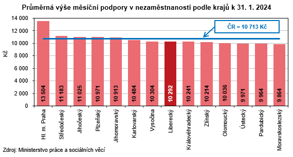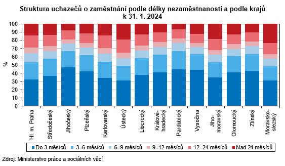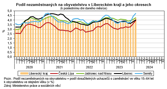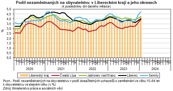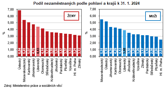 Podíl nezaměstnaných k 31. 1. 2024 se ve srovnání s koncem prosince 2023 zvýšil v celé České republice (+0,23 p. b. na 3,96 %) a také ve všech zbývajících krajích. Nejvýraznější nárůst byl vykázán v Jihočeském kraji (+0,41 p. b. na 3,53 %), nejnižší v hlavním městě Praze (+0,06 p. b. na 2,86 %). Napříč 14 regiony České republiky se pak nezaměstnanost pohybovala mezi 2,86 % v hl. m. Praze a 6,00 % v Ústeckém kraji. Podíl vykázaný v Libereckém kraji byl 5. nejvyšší.