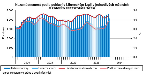 K 31. 1. 2024 registrovaly úřady práce v Libereckém kraji celkem 13 184 neumístěných uchazečů o zaměstnání, tj. o 699 osob (5,6 %) více než na konci minulého měsíce. Počet žen bez zaměstnání se zvýšil o 186 osob (2,7 %) na 6 973 osob (tj. 52,9 % z celkového počtu uchazečů). Počet nezaměstnaných mužů se rozrostl o 513 osob (+9,0 %) a činil 6 211 osob. Osoby se zdravotním postižením tvořily 12,8 % uchazečů, absolventi a mladiství představovali 5,2 % nezaměstnaných. Do skupiny dosažitelných ve věku 15–64 let patřilo 11 754 uchazečů (z toho 6 181 žen), tj. 89,2 % z celkového počtu nezaměstnaných. Podporu v nezaměstnanosti pobíralo 4 664 uchazečů (35,4 % z celkového počtu uchazečů) a její průměrná výše dosáhla částky 10 292 Kč (tj. o 421 Kč pod republikovým průměrem). Uchazečům o zaměstnání v Libereckém kraji bylo v průměru 42,6 let. Podíl dlouhodobě nezaměstnaných (tj. nezaměstnaných evidovaných na úřadech práce déle než 12 měsíců) dosáhl v našem kraji 26,3 %.