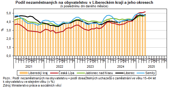 K 30. dubnu 2025 dosáhl podíl nezaměstnaných v Libereckém kraji 4,85 % a mezi kraji se jednalo o 4. nejvyšší hodnotu. Oproti konci minulého měsíce se nezaměstnanost zvýšila o 0,05 procentních bodů (p. b.), ve srovnání s koncem dubna 2024 byl podíl vyšší o 0,78 p. b. Nezaměstnanost žen pak byla ve srovnání s koncem března vyšší o 0,19 p. b. a činila 5,25 %, naopak nezaměstnanost v případě mužů poklesla o 0,08 p. b. na 4,46 %.