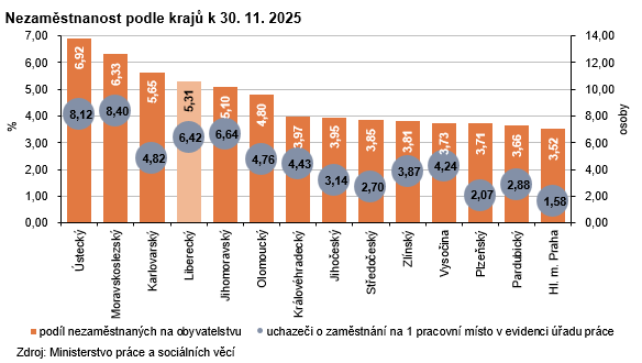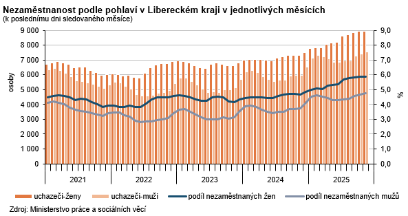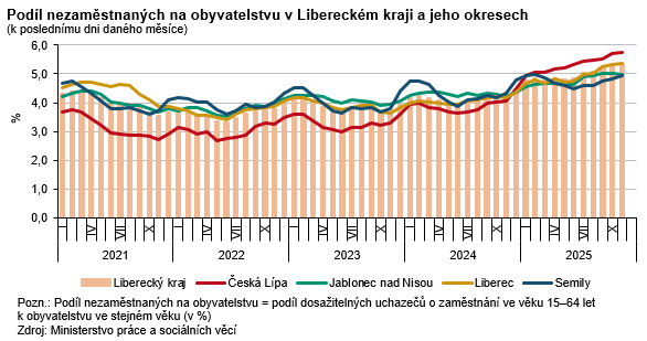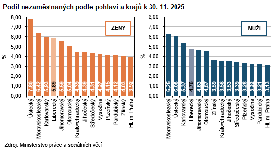 K 30. listopadu 2025 dosáhl podíl nezaměstnaných v Libereckém kraji 5,31 % a mezi kraji se jednalo o 4. nejvyšší hodnotu. Meziměsíčně se nezaměstnanost zvýšila o 0,04 procentních bodů (p. b.), ve srovnání s koncem listopadu 2024 byl dosažený podíl vyšší o 1,12 p. b. Nezaměstnanost žen v zásadě stagnovala, když byla ve srovnání s koncem října 2025 vyšší pouze o 0,01 p. b. a činila 5,89 %, u mužů se zvýšila o 0,08 p. b. na 4,76 %.