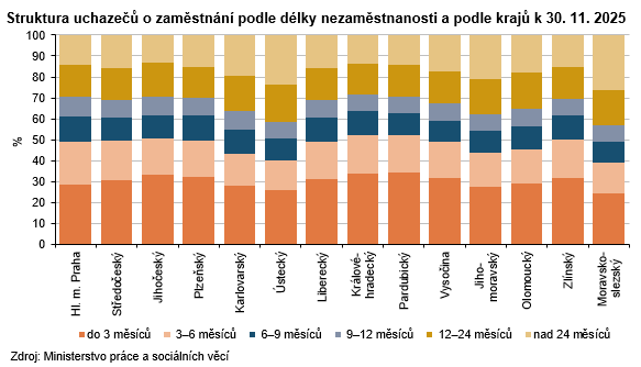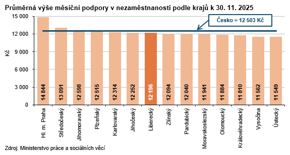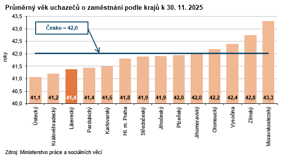 K 30. 11. 2025 registrovaly úřady práce v Libereckém kraji celkem 16 454 neumístěných uchazečů o zaměstnání, tj. o 126 osob (0,8 %) více než ke konci října 2025. Počet žen bez zaměstnání se navýšil pouze o 1 osobu, 8 912 žen představovalo 54,2 % celkového počtu nezaměstnaných. Počet nezaměstnaných mužů vzrostl o 125 osob (+1,7 %) na 7 542 osob. Osoby se zdravotním postižením tvořily 12,4 % uchazečů, absolventi a mladiství představovali 7,4 % nezaměstnaných. Do skupiny dosažitelných ve věku 15–64 let patřilo 15 179 uchazečů (tj. 92,3 % z celkového počtu nezaměstnaných), z toho 8 270 žen. Podporu v nezaměstnanosti pobíralo 4 506 uchazečů (tj. 27,4 % z celkového počtu uchazečů) a její průměrná výše dosáhla částky 12 196 Kč (tj. o 306 Kč pod republikovým průměrem). Nejvyšší podporu v rámci krajů pobírali nezaměstnaní v hlavním městě Praze (14 844 Kč), nejnižší uchazeči v Ústeckém kraji (11 549 Kč). Uchazečům o zaměstnání v Libereckém kraji bylo v průměru 41,4 let. Více než třetina uchazečů připadla do věkové kategorie 45 až 59 let (33,7 %), 11,6 % uchazečům bylo mezi 55 až 59 lety. Do kategorie 65 a více let patřilo 1,3 % uchazečů, nejmladší uchazeči do 19 let tvořili 7,8 % nezaměstnaných. Podíl dlouhodobě nezaměstnaných (tj. nezaměstnaných evidovaných na úřadech práce déle než 12 měsíců) dosáhl v našem kraji 31,2 %. V mezikrajském srovnání se tento ukazatel pohyboval v intervalu od 28,3 % v Královéhradeckém do 42,9 % v Moravskoslezském kraji.