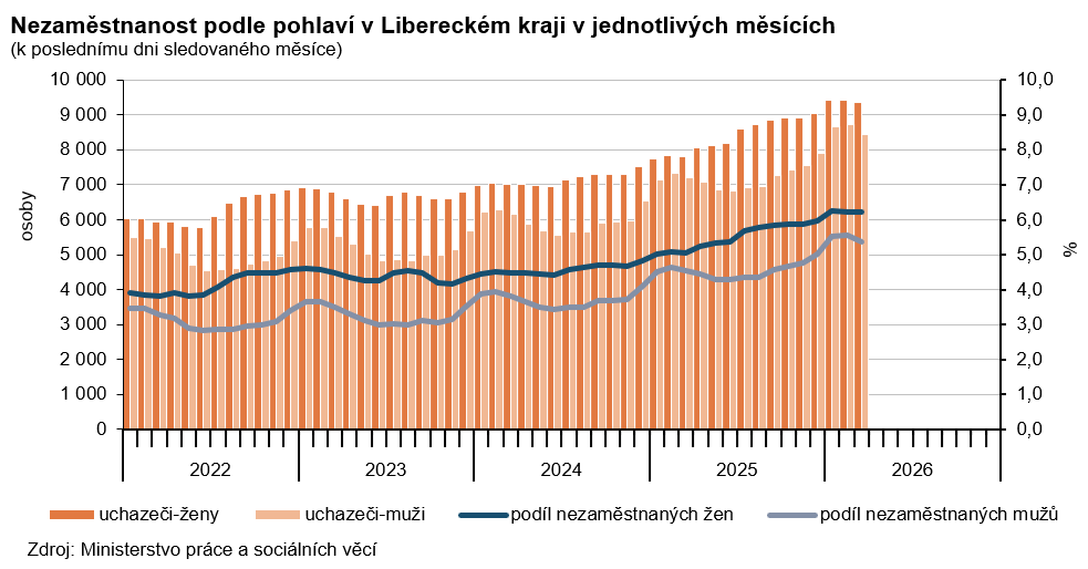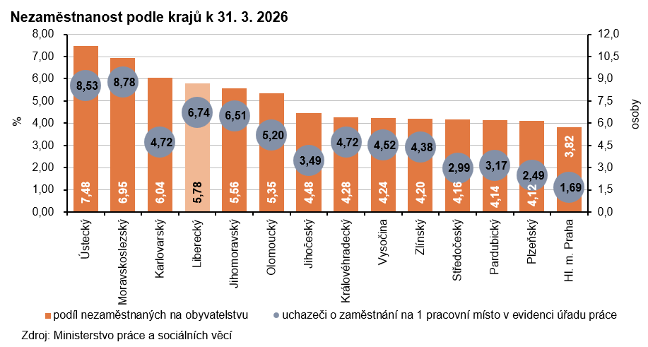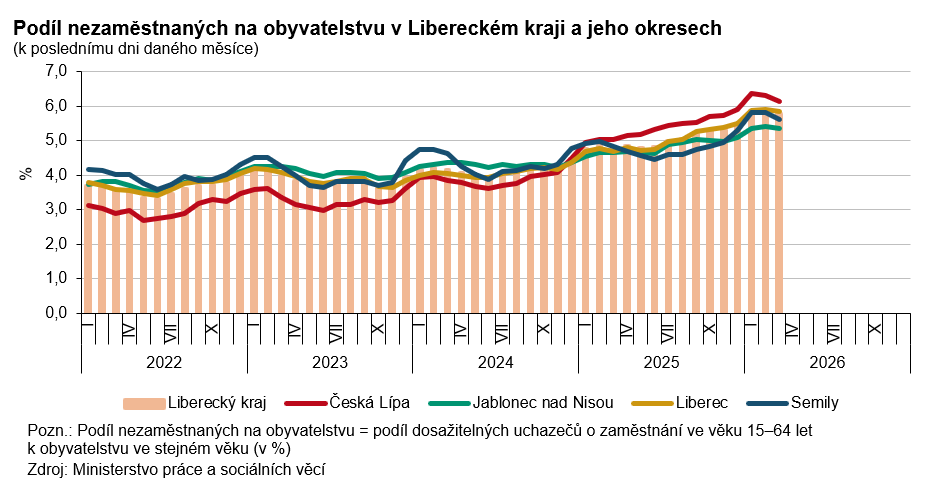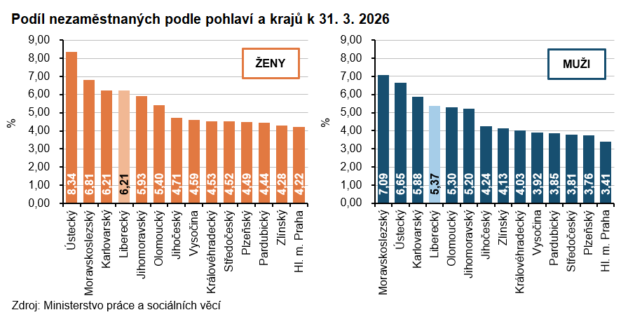 K 31. březnu 2026 dosáhl podíl nezaměstnaných v Libereckém kraji 5,78 % a mezi kraji se jednalo i tentokrát o 4. nejvyšší hodnotu. Meziměsíčně se nezaměstnanost snížila o 0,11 procentních bodů (p. b.), ve srovnání s koncem března 2025 však byla vyšší o 0,99 p. b. Nezaměstnanost žen ve srovnání s koncem února 2026 poklesla o 0,03 p. b. na 6,21 %, u mužů se hodnota ukazatele snížila o 0,19 p. b. na 5,37 %.