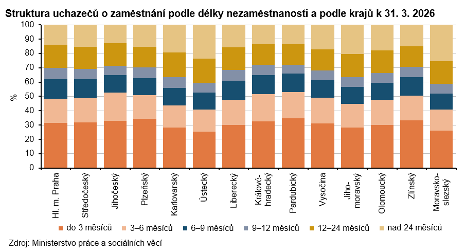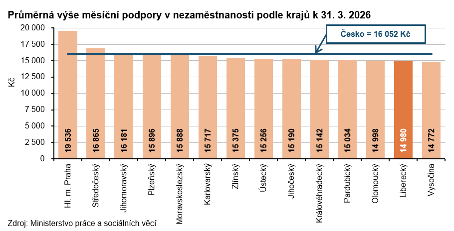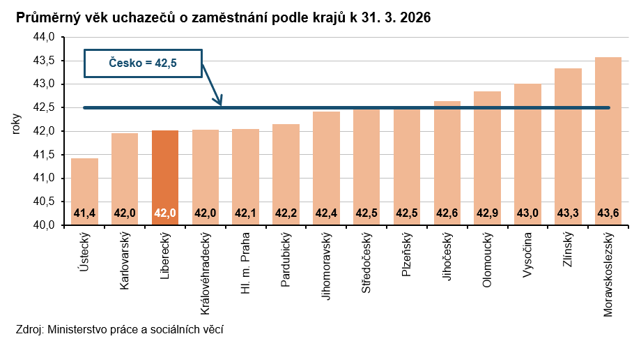 K poslednímu březnovému dni roku 2026 registrovaly úřady práce v Libereckém kraji celkem 17 788 neumístěných uchazečů o zaměstnání, tj. o 346 osob (1,9 %) méně než ke konci února 2026. Počet žen bez zaměstnání se snížil o 69 osob (-0,7 %) a 9 353 žen představovalo 52,6 % celkového počtu nezaměstnaných. Počet nezaměstnaných mužů byl nižší o 277 osob (-3,2 %) a činil 8 435 osob. Osoby se zdravotním postižením tvořily 12,6 % uchazečů, absolventi a mladiství představovali 6,0 % nezaměstnaných. Do skupiny dosažitelných ve věku 15–64 let patřilo 16 522 uchazečů (tj. 92,9 % z celkového počtu nezaměstnaných), z toho 8 722 žen. Podporu v nezaměstnanosti pobíralo 5 021 uchazečů (tj. 28,2 % z celkového počtu uchazečů) a její průměrná výše dosáhla částky 14 980 Kč, tj. o 1 072 Kč pod republikovým průměrem. Nejvyšší podporu v rámci krajů pobírali nezaměstnaní v hlavním městě Praze (19 536 Kč), nejnižší uchazeči v Kraji Vysočina (14 772 Kč). Uchazečům o zaměstnání v Libereckém kraji bylo v průměru 42,0 let. Více než třetina uchazečů připadla do věkové kategorie 45 až 59 let (34,3 %) s tím, že 11,8 % uchazečů bylo mezi 50 až 54 lety. Do kategorie 65 a více let patřilo 1,2 % uchazečů, nejmladší uchazeči do 19 let tvořili 6,5 % nezaměstnaných. Podíl dlouhodobě nezaměstnaných (tj. nezaměstnaných evidovaných na úřadech práce déle než 12 měsíců) dosáhl v našem kraji 31,6 %. V mezikrajském srovnání se tento ukazatel pohyboval v intervalu od 27,8 % v Královéhradeckém a Pardubickém kraji do 41,3 % v Moravskoslezském kraji.