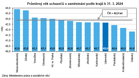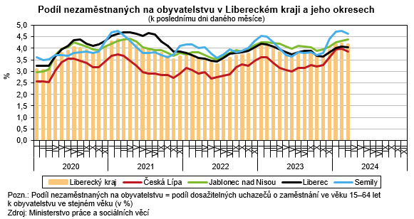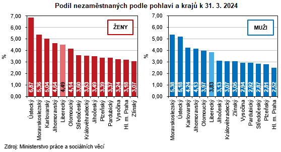 Podíl nezaměstnaných k 31. 3. 2024 se ve srovnání s koncem února 2024 v celé České republice snížil o 0,11 p. b. na 3,86 %. Ke snížení došlo ve všech 14 krajích, nejvýrazněji v Kraji Vysočina a v Jihočeském kraji (shodně o 0,20 p. b. na 3,09 %, resp. 3,31 %). Nejméně nezaměstnanost poklesla v Karlovarském kraji (-0,01 p. b. na 4,63 %). Napříč 14 regiony České republiky se pak nezaměstnanost pohybovala mezi 2,85 % v hlavním městě Praze a 6,01 % v Ústeckém kraji. Podíl vykázaný v Libereckém kraji byl 5. nejvyšší.