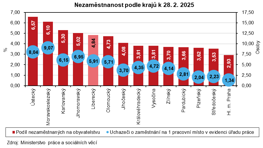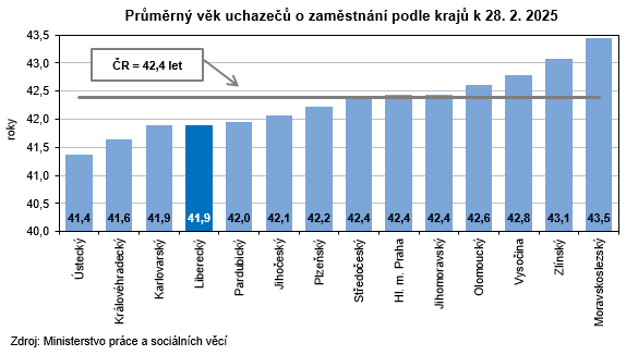 K 28. 2. 2025 registrovaly úřady práce v Libereckém kraji celkem 15 160 neumístěných uchazečů o zaměstnání, tj. o 266 osob (1,8 %) více než k 31. 1. 2025. Počet žen bez zaměstnání vzrostl o 79 osob (1,0 %) na 7 830 osob a ženy tak představovaly 51,6 % celkového počtu nezaměstnaných. Počet nezaměstnaných mužů se zvýšil o 187 osob (+2,6 %) a čítal 7 330 osob. Osoby se zdravotním postižením tvořily 12,2 % uchazečů, absolventi a mladiství představovali 6,0 % nezaměstnaných. Do skupiny dosažitelných ve věku 15–64 let patřilo 13 817 uchazečů (z toho 7 128 žen), tj. 91,1 % z celkového počtu nezaměstnaných. Podporu v nezaměstnanosti pobíralo 4 774 uchazečů (tj. 31,5 % z celkového počtu uchazečů) a její průměrná výše dosáhla částky 13 027 Kč (tj. o 659 Kč pod republikovým průměrem). Nejvyšší podporu v rámci krajů pobírali nezaměstnaní v hlavním městě Praze (16 898 Kč), nejnižší uchazeči v Pardubickém kraji (12 627 Kč). Uchazečům o zaměstnání v Libereckém kraji bylo v průměru 41,9 let. Podíl dlouhodobě nezaměstnaných (tj. nezaměstnaných evidovaných na úřadech práce déle než 12 měsíců) dosáhl v našem kraji 28,2 %. Mezi kraji se tento ukazatel pohyboval v intervalu od 21,9 % v Jihočeském kraji do 38,8 % v Moravskoslezském kraji.