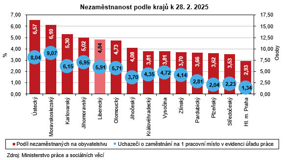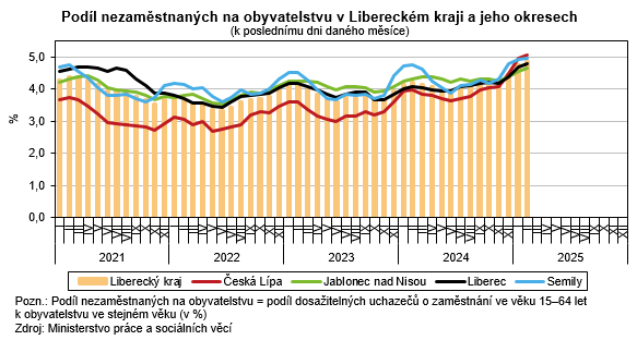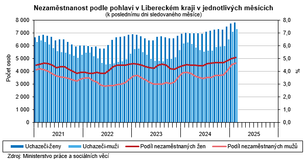 K 28. lednu 2025 dosáhl podíl nezaměstnaných v Libereckém kraji 4,84 %. Oproti konci minulého měsíce se nezaměstnanost zvýšila o 0,09 procentních bodů (p. b.), ve srovnání s koncem února 2024 byl podíl vyšší o 0,63 p. b. Meziměsíčně vyšší podíl nezaměstnaných zaznamenala obě pohlaví – v případě mužů došlo k nárůstu o 0,12 p. b. na 4,63 %, v případě žen o 0,06 p. b. na 5,07 %.