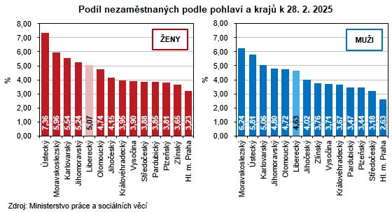 Podíl nezaměstnaných se v celé České republice meziměsíčně zvýšil o 0,08 p. b. na 4,38 %. K nárůstu hodnoty došlo také ve všech zbývajících krajích – nejvýrazněji v Karlovarském kraji, a to o 0,24 p. b. na 5,30 %. Naopak k nejmenšímu zvýšení došlo v Královéhradeckém kraji (pouze +0,02 p. b. na 3,81 %). Napříč kraji se únorový podíl nezaměstnaných pohyboval v rozmezí od 2,93 % v hlavním městě Praze do 6,57 % v Ústeckém kraji. Podíl dosažený v Libereckém kraji zůstal 5. nejvyšším. Nejnižší nezaměstnanost žen zaznamenalo opět hlavní město Praha (3,23 %), nejvyšší Ústecký kraj (7,36 %). V případě mužů byl nejnižší podíl nezaměstnaných zjištěn taktéž v hlavním městě Praze (2,63 %), nejvyšší pak v Moravskoslezském regionu (6,24 %). Libereckým ženám patřila 5. a mužům 6. nejhorší pozice.