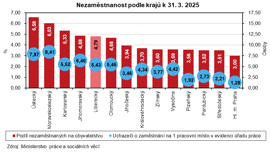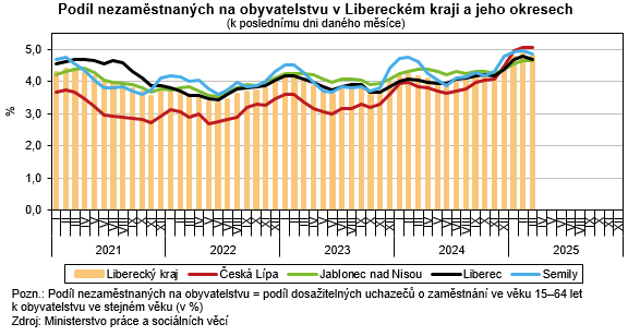K 31. březnu 2025 dosáhl podíl nezaměstnaných v Libereckém kraji 4,79 %. Oproti konci minulého měsíce se nezaměstnanost snížila o 0,05 procentních bodů (p. b.), ve srovnání s koncem března 2024 byl však podíl vyšší o 0,64 p. b. Meziměsíčně nižší podíl nezaměstnaných zaznamenala obě pohlaví – v případě mužů došlo k poklesu o 0,09 p. b. na 4,54 %, v případě žen o 0,01 p. b. na 5,06 %.