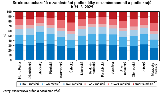 K 31. 3. 2025 registrovaly úřady práce v Libereckém kraji celkem 15 011 neumístěných uchazečů o zaměstnání, tj. o 149 osob (-1,0 %) méně než k 28. 2. 2025. Počet žen bez zaměstnání byl nižší o 20 osob (-0,3 %) a činil 7 810 osob, ženy tak představovaly 52,0 % celkového počtu nezaměstnaných. Počet nezaměstnaných mužů poklesl o 129 osob (-1,8 %) a čítal 7 201 osob. Osoby se zdravotním postižením tvořily 12,4 % uchazečů, absolventi a mladiství představovali 6,2 % nezaměstnaných. Do skupiny dosažitelných ve věku 15–64 let patřilo 13 675 uchazečů (z toho 7 114 žen), tj. 91,1 % z celkového počtu nezaměstnaných. Podporu v nezaměstnanosti pobíralo 4 500 uchazečů (tj. 30,0 % z celkového počtu uchazečů) a její průměrná výše dosáhla částky 11 052 Kč (tj. o 460 Kč pod republikovým průměrem). Nejvyšší podporu v rámci krajů pobírali nezaměstnaní v hlavním městě Praze (14 211 Kč), nejnižší uchazeči v Pardubickém kraji (10 567 Kč). Uchazečům o zaměstnání v Libereckém kraji bylo v průměru 41,9 let. Podíl dlouhodobě nezaměstnaných (tj. nezaměstnaných evidovaných na úřadech práce déle než 12 měsíců) dosáhl v našem kraji 28,9 %. Mezi kraji se tento ukazatel pohyboval v intervalu od 23,2 % v Jihočeském kraji do 39,6 % v Moravskoslezském kraji.