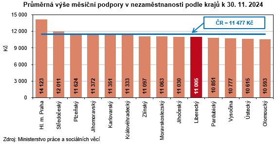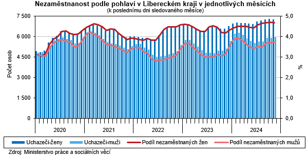 K 30. 11. 2024 registrovaly úřady práce v Libereckém kraji celkem 13 277 neumístěných uchazečů o zaměstnání, tj. o 19 osob (0,1 %) více než k 31. 10. 2024. Počet žen bez zaměstnání poklesl o 21 osob (0,3 %) na 7 293 osob a ženy tak představovaly 54,9 % celkového počtu nezaměstnaných. Počet nezaměstnaných mužů se naopak o 40 osob (+0,7 %) zvýšil a čítal 5 984 osob. Osoby se zdravotním postižením tvořily 13,4 % uchazečů, absolventi a mladiství představovali 7,1 % nezaměstnaných. Do skupiny dosažitelných ve věku 15–64 let patřilo 11 948 uchazečů (z toho 6 568 žen), tj. 90,0 % z celkového počtu nezaměstnaných. Podporu v nezaměstnanosti pobíralo 4 181 uchazečů (tj. 31,5 % z celkového počtu uchazečů) a její průměrná výše dosáhla částky 11 005 Kč (tj. o 472 Kč pod republikovým průměrem). Nejvyšší podporu v rámci krajů pobírali nezaměstnaní v hlavním městě Praze (14 123 Kč), nejnižší uchazeči v Olomouckém kraji (10 593 Kč). Uchazečům o zaměstnání v Libereckém kraji bylo v průměru 42,0 let. Podíl dlouhodobě nezaměstnaných (tj. nezaměstnaných evidovaných na úřadech práce déle než 12 měsíců) dosáhl v našem kraji 29,3 %. Mezi kraji se tento ukazatel pohyboval v intervalu od 24,5 % v Jihočeském do 39,8 % v Moravskoslezském kraji.