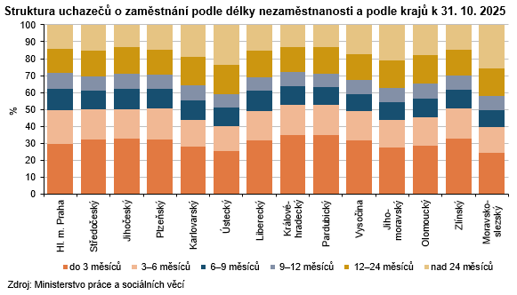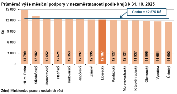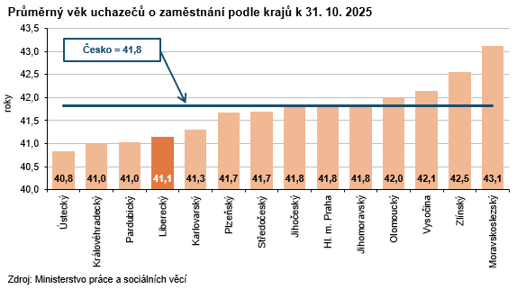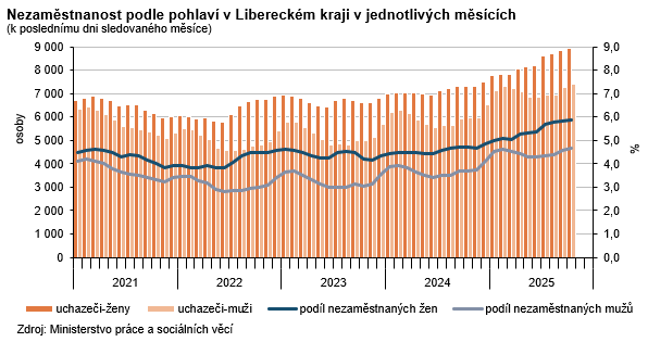 K 31. 10. 2025 registrovaly úřady práce v Libereckém kraji celkem 16 328 neumístěných uchazečů o zaměstnání, tj. o 232 osob (1,4 %) více než ke konci září 2025. Počet žen bez zaměstnání byl vyšší o 74 osob (+0,8 %), 8 911 žen představovalo 54,6 % celkového počtu nezaměstnaných. Počet nezaměstnaných mužů vzrostl o 158 osob (+2,2 %) na 7 417 osob. Osoby se zdravotním postižením tvořily 12,3 % uchazečů, absolventi a mladiství představovali 8,0 % nezaměstnaných. Do skupiny dosažitelných ve věku 15–64 let patřilo 15 060 uchazečů (tj. 92,2 % z celkového počtu nezaměstnaných), z toho 8 260 žen. Podporu v nezaměstnanosti pobíralo 4 494 uchazečů (tj. 27,5 % z celkového počtu uchazečů) a její průměrná výše dosáhla částky 12 187 Kč (tj. o 388 Kč pod republikovým průměrem). Nejvyšší podporu v rámci krajů pobírali nezaměstnaní v hlavním městě Praze (14 799 Kč), nejnižší uchazeči v Ústeckém kraji (11 602 Kč). Uchazečům o zaměstnání v Libereckém kraji bylo v průměru 41,1 let. Třetina uchazečů připadla do věkové kategorie 45 až 59 let (33,1 %), 11,6 % uchazečům bylo mezi 55 až 59 lety. Do kategorie 65 a více let patřilo 1,3 % uchazečů, nejmladší uchazeči do 19 let tvořili 8,3 % nezaměstnaných. Podíl dlouhodobě nezaměstnaných (tj. nezaměstnaných evidovaných na úřadech práce déle než 12 měsíců) dosáhl v našem kraji 30,8 %. Mezi kraji se tento ukazatel pohyboval v intervalu od 27,8 % v Královéhradeckém do 42,1 % v Moravskoslezském kraji.