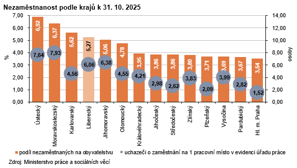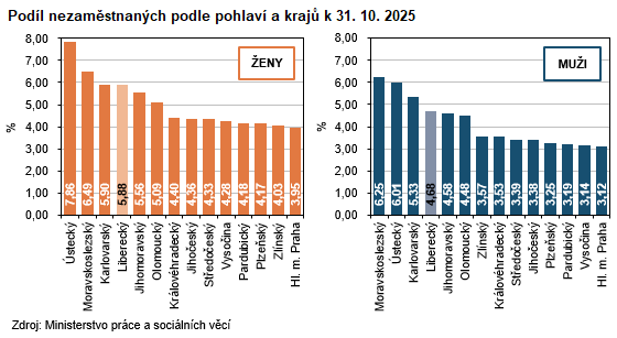 Podíl nezaměstnaných se v celém Česku meziměsíčně zvýšil ze 4,55 % na 4,58 %. K navýšení hodnoty tohoto ukazatele vedle Libereckého kraje došlo s různou intenzitou také v dalších 12 regionech, pouze v Plzeňském kraji došlo k poklesu o 0,01 p. b. na 3,71 %. Nejvýraznější nárůst nezaměstnanosti byl během října vykázán v Karlovarském kraji (+0,11 p. b. na 5,62 %), následoval Jihočeský kraj (+0,09 p. b. na 3,86 %). Nejnižší nezaměstnanost celkem a také u obou pohlaví evidovalo hlavní město Praha (3,54 % celkem, 3,95 % v případě žen, 3,12 % v případě mužů). Nejvyšší podíl nezaměstnaných celkem a žen evidoval Ústecký kraj (6,92 %, resp. 7,86 %), podíl mužů Moravskoslezský kraj (6,25 %). Libereckým ženám i mužům patřila v tomto srovnání 4. nejhorší pozice.