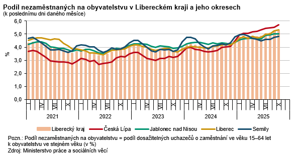 K 31. říjnu 2025 dosáhl podíl nezaměstnaných v Libereckém kraji 5,27 % a mezi kraji se jednalo o 4. nejvyšší hodnotu. Takto vysokou hodnotu nezaměstnanosti náš kraj naposledy zaznamenal v lednu 2017 (shodně 5,27 %). Meziměsíčně se nezaměstnanost zvýšila o 0,07 procentních bodů (p. b.), ve srovnání s koncem října 2024 byl dosažený podíl vyšší o 1,08 p. b. Nezaměstnanost žen byla ve srovnání s koncem září 2025 vyšší o 0,04 p. b. a činila 5,88 %, u mužů se zvýšila o 0,11 p. b. na 4,68 %.