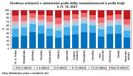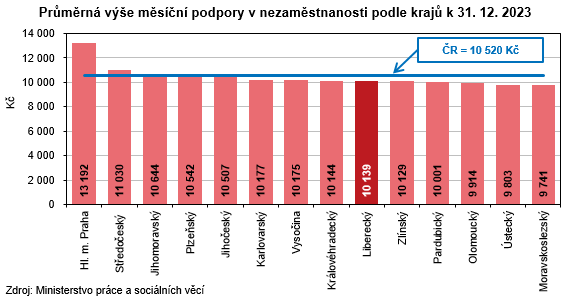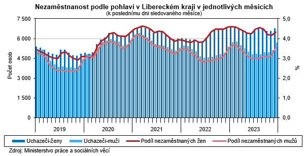 K 31. 12. 2023 registrovaly úřady práce v Libereckém kraji celkem 12 485 neumístěných uchazečů o zaměstnání, tj. o 758 osob (6,5 %) více než na konci minulého měsíce. Počet žen bez zaměstnání vzrostl o 190 osob (2,9 %) na 6 787 osob (tj. 54,4 % z celkového počtu uchazečů). Počet nezaměstnaných mužů se zvýšil o 568 osob (+11,1 %) a činil 5 698 osob. Osoby se zdravotním postižením tvořily 13,5 % uchazečů, absolventi a mladiství představovali 5,6 % nezaměstnaných. Do skupiny dosažitelných ve věku 15–64 let patřilo 11 109 uchazečů, tj. 89,0 % z celkového počtu nezaměstnaných. Podporu v nezaměstnanosti pobíralo 4 050 uchazečů (32,4 % z celkového počtu uchazečů) a její průměrná výše dosáhla částky 10 139 Kč (tj. o 381 Kč pod republikovým průměrem). Uchazečům o zaměstnání v Libereckém kraji bylo v průměru 42,4 let. Podíl dlouhodobě nezaměstnaných v našem kraji (tj. nezaměstnaných evidovaných na úřadech práce déle než 12 měsíců) dosáhl 27,2 %.