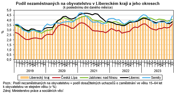 Nárůst nezaměstnanosti mezi listopadem a prosincem 2023 vykázaly všechny okresy Libereckého kraje – v okrese Semily +0,62 p. b. na 4,42 %, v okrese Česká Lípa +0,33 p. b. na 3,62 %, v okrese Liberec +0,18 p. b. na 3,84 % a v okrese Jablonec nad Nisou +0,13 p. b. na 4,07 %. V žebříčku 77 okresů České republiky se pak z pohledu hodnoty podílu nezaměstnaných nejlépe umístil okres Česká Lípa (44. pozice), následoval okres Liberec (49. pozice), okres Jablonec nad Nisou (53. pozice) a nejméně příznivé umístění získal okres Semily (59. pozice). Nejnižší podíl nezaměstnaných zaznamenal okres Praha-východ (1,42 %), nejvyšší okres Karviná (8,16 %).