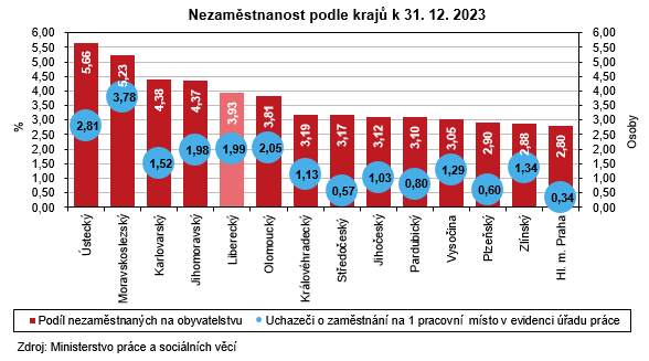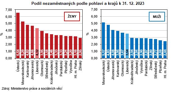 Podíl nezaměstnaných k 31. prosinci 2023 v Libereckém kraji dosáhl 3,93 %. Oproti konci minulého měsíce se nezaměstnanost zvýšila o 0,27 procentních bodů (p. b.), ve srovnání s koncem prosince 2022 byl podíl nižší o 0,04 p. b. Meziměsíčně vyšší podíl nezaměstnaných zaznamenala obě dvě pohlaví – v případě mužů došlo k nárůstu o 0,39 p. b. na 3,54 %, v případě žen o 0,15 p. b. na 4,32 %.