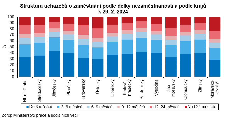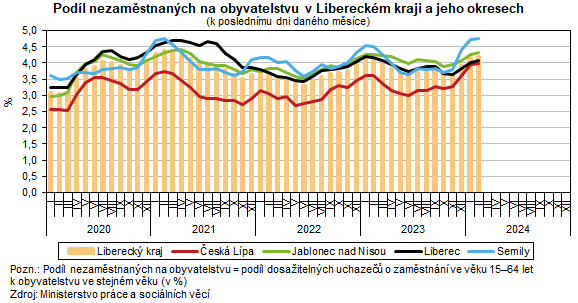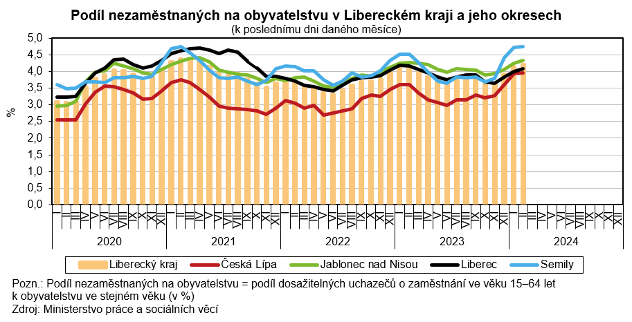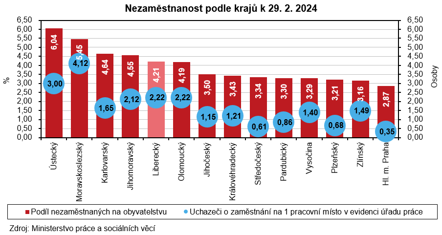 Podíl nezaměstnaných k 29. 2. 2024 ve srovnání s koncem ledna 2024 v celé České republice nepatrně vzrostl z 3,96 na 3,97 %. Ke zvýšení došlo v 6 krajích, nejvýrazněji právě v našem regionu. Pokles nezaměstnanosti zaznamenalo 8 krajů – ten nejvyšší Karlovarský kraj (-0,04 p. b. na 4,64 %). Napříč 14 regiony České republiky se pak nezaměstnanost pohybovala mezi 2,87 % v hlavním městě Praze a 6,04 % v Ústeckém kraji. Podíl vykázaný v Libereckém kraji byl 5. nejvyšší.
