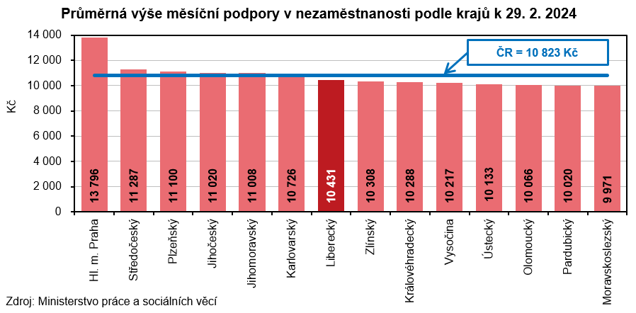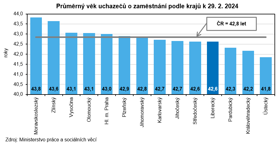 K 29. 2. 2024 registrovaly úřady práce v Libereckém kraji celkem 13 345 neumístěných uchazečů o zaměstnání, tj. o 161 osob (1,2 %) více než na konci minulého měsíce. Počet žen bez zaměstnání se zvýšil o 72 osob (+1,0 %) na 7 045 osob (tj. 52,8 % z celkového počtu uchazečů). Počet nezaměstnaných mužů se rozrostl o 89 osob (+1,4 %) a činil 6 300 osob. Osoby se zdravotním postižením tvořily 12,9 % uchazečů, absolventi a mladiství představovali 5,3 % nezaměstnaných. Do skupiny dosažitelných ve věku 15–64 let patřilo 11 911 uchazečů (z toho 6 273 žen), tj. 89,3 % z celkového počtu nezaměstnaných. Podporu v nezaměstnanosti pobíralo 4 717 uchazečů (35,3 % z celkového počtu uchazečů) a její průměrná výše dosáhla částky 10 431 Kč (tj. o 392 Kč pod republikovým průměrem). Uchazečům o zaměstnání v Libereckém kraji bylo v průměru 42,6 let. Podíl dlouhodobě nezaměstnaných (tj. nezaměstnaných evidovaných na úřadech práce déle než 12 měsíců) dosáhl v našem kraji 26,1 %.