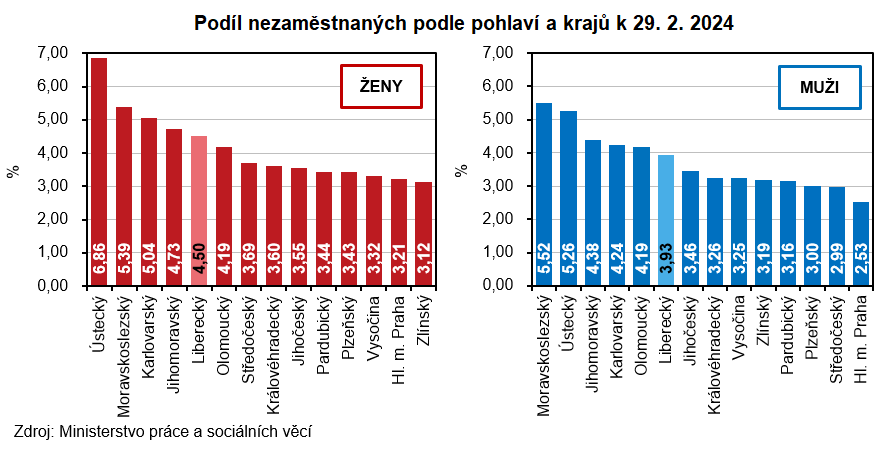 Podíl nezaměstnaných k 29. únoru 2024 v Libereckém kraji dosáhl 4,21 %. Oproti konci minulého měsíce se nezaměstnanost zvýšila o 0,06 procentních bodů (p. b.), ve srovnání s koncem února 2023 byl podíl vyšší o 0,10 p. b. Vyšší hodnota nezaměstnanosti byla v našem kraji naposledy registrována v dubnu 2021 (4,29 %). Meziměsíčně vyšší podíl nezaměstnaných zaznamenala obě dvě pohlaví – v případě mužů došlo k nárůstu o 0,05 p. b. na 3,93 %, v případě žen o 0,07 p. b. na 4,50 %.