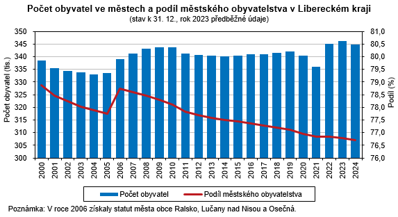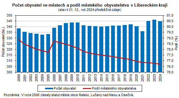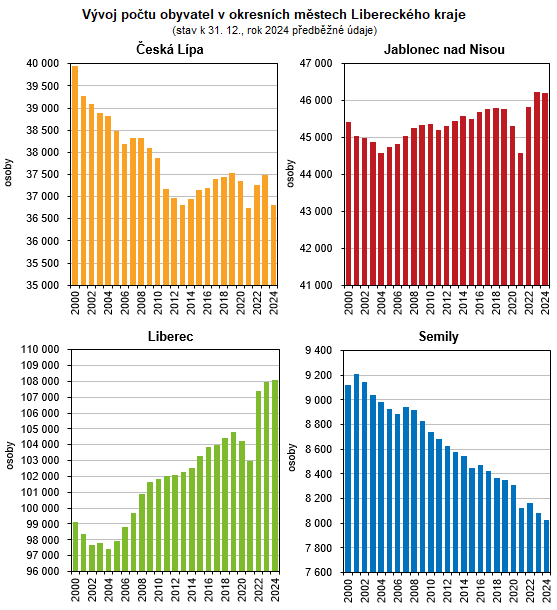 Podle bilance obyvatel k 31. 12. 2024 žilo ve 39 městech Libereckého kraje předběžně 344 819 obyvatel, tj. o 1 280 osob (0,4 %) méně než na začátku roku 2024. Stěhováním města ztratila 158 obyvatel, přirozenou měnou pak 1 122 osob.