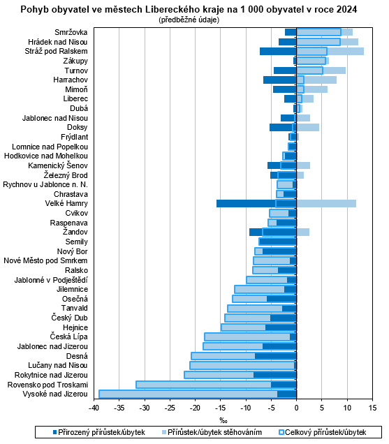 Celkový přírůstek obyvatel vykázalo pouze 9 měst – absolutně nejvyšší byl zaznamenán v Liberci (+108 obyvatel, tj. +1,0 ‰), relativní pak ve Smržovce (+8,7 osob na 1 000 obyvatel, tj. +34 osob). Dále bylo celkového přírůstku obyvatel dosaženo také v Turnově (+75 osob, tj. +5,1 ‰), Hrádku nad Nisou (+69 osob, tj. +8,6 ‰), Stráži pod Ralskem (+23 osob, tj. +6,0 ‰), Zákupech (+17 osob, tj. +5,7 ‰), Mimoni (+9 osob, tj. +1,4 ‰), Harrachově (+2 osoby, tj. +1,4 ‰) a Dubé (+1 osoba, tj. +0,6 ‰). Méně obyvatel tak proti začátku roku evidovalo 30 měst. Absolutně nejvyšší pokles byl zaznamenán ve městě Česká Lípa (-668 osob), relativní pak ve Vysokém nad Jizerou (-39,0 ‰).