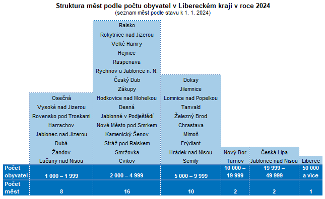 Nejmenším městem Libereckého kraje byla ke konci roku 2024 s 1 184 obyvateli Osečná. V dalším pořadí následovalo Vysoké nad Jizerou (1 278 obyvatel), Rovensko pod Troskami (1 371 obyvatel) a Harrachov (1 388 obyvatel). Na opačném konci krajského žebříčku se nachází krajské město Liberec (108 090 obyvatel), které je zároveň 5. největším městem v České republice. Mezi 50 největších měst patří také Jablonec nad Nisou (24. místo, 46 209 obyvatel) a Česká Lípa (27. místo, 36 815 obyvatel).