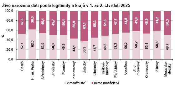 V průběhu 1. pololetí letošního roku se v Libereckém kraji živě narodilo 1 522 dětí, z toho 757 chlapců (49,7 %). V přepočtu na 1 000 obyvatel to představuje 6,8 dětí, tj. 7. nejnižší krajská hodnota. Ve srovnání se stejným obdobím předchozího roku přišlo v našem kraji na svět o 181 dětí (-10,6 %) méně. V pořadí jako první se narodilo 44,6 % uvedených dětí, 38,2 % se narodilo jako druhé a 17,2 % jako třetí a další. Většina živě narozených dětí se narodila nesezdaným párům (55,3 %). V mezikrajském žebříčku se jedná o 3. nejvyšší hodnotu, vyšší podíl živě narozených mimo manželství byl vykázán již jen v Karlovarském (56,9 %) a Ústeckém kraji (63,1 %). Na opačném konci srovnání se s podílem 38,0 % umístilo hlavní město Praha. Mezi okresy našeho kraje byl nejvyšší podíl dětí narozených mimo manželství zaznamenán v okrese Jablonec nad Nisou (59,0 %) a v rámci 77 okresů České republiky mu patřila 68. příčka. Okresu Česká Lípa v tomto srovnání patřilo 65. místo (57,2 %) a okresu Liberec 58. místo (54,7 %). Okres Semily se s hodnotou 49,4 % umístil na 40. místě. Napříč okresy Česka se podíl živě narozených mimo manželství pohyboval v rozmezí od 35,5 % v okrese Brno-venkov do 71,8 % v okrese Most. Podíl za celé Česko dosáhl hodnoty 47,3 %.