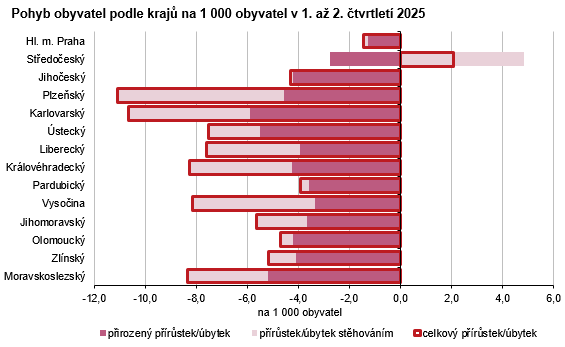 Od počátku roku 2025 se počet obyvatel snížil ve 13 krajích Česka, výjimkou byl pouze Středočeský region. Všechny kraje však vykázaly záporné saldo přirozené měny a pouze Středočeský kraj zaznamenal kladné migrační saldo. Ve Středočeském regionu tedy přírůstek obyvatel stěhováním převýšil přirozený úbytek o 1 508 osob. Absolutně nejvyšší úbytek populace dosáhl Moravskoslezský kraj (-4 875 obyvatel), relativně nejvyšší pokles Plzeňský kraj (-11,1 osob na 1 000 obyvatel). Absolutně i relativně nejnižší pokles počtu obyvatel vykázalo hlavní město Praha (-994 osob, tj. -1,4 ‰). Přírůstek zahraniční migrací byl dosažen pouze v hlavním městě Praze (+598 osob), ostatní kraje stěhováním s cizinou přišly o obyvatele a úbytek se pohyboval v rozmezí od -100 osob v Olomouckém do -1 656 osob v Plzeňském kraji. Kladná hodnota salda vnitřní migrace byla evidována ve Středočeském (+3 868 osob), Jihočeském (+426 osob) a Pardubickém kraji (+82 osob). V ostatních krajích bylo zaznamenáno záporné saldo a hodnota se pohybovala od -53 osob v Olomouckém do -1 145 osob v Moravskoslezském kraji. V úhrnu za Česko se počet obyvatel od počátku roku do konce června snížil o 27 159 osob na 10 882 341 obyvatel. Přirozenou měnou stát ztratil 20 293 osob, stěhováním 6 866 osob.