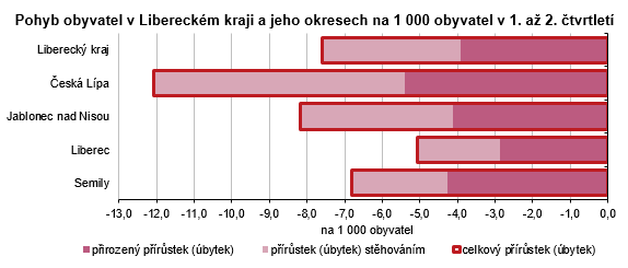 Snížení počtu obyvatel vykázaly také všechny okresy Libereckého kraje – absolutně i relativně nejvyšší celkový úbytek zaznamenal okres Česká Lípa (-614 osob, v přepočtu na 1 000 obyvatel -12,1 ‰). Ve všech okresech zemřelo v první polovině letošního roku více obyvatel, než se narodilo a okresy tak vykázaly přirozený úbytek obyvatel. Všechny okresy také zaznamenaly úbytek obyvatel stěhováním s tím, že pouze okresy Liberec a Semily získaly obyvatele zásluhou vnitřního stěhování.