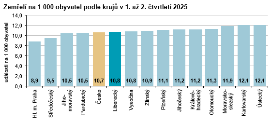 Ve sledovaném období v Libereckém kraji zemřelo 2 395 osob, (tj. o 33 osob a 1,4 % více než ve stejném období loňského roku), mezi kterými z 53,1 % převažovali muži. V přepočtu na 1 000 obyvatel připadlo 10,8 zemřelých, což je 5. nejnižší hodnota mezi kraji. Nejvíce zemřelých na 1 000 obyvatel bylo vykázáno v Ústeckém a Karlovarském kraji (shodně 12,1 ‰), nejméně v hlavním městě Praze (8,9 ‰). Do jednoho roku od narození zemřelo v našem regionu 5 dětí, kojenecká úmrtnost tak činila 3,3 ‰. Mezi zemřelými byla nejčetněji zastoupena věková skupina osob ve věku 70–79 let (31,5 % z celkového počtu zemřelých), druhou nejpočetnější skupinou byly osoby ve věku 80–89 let (30,9% podíl).