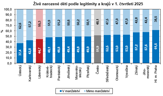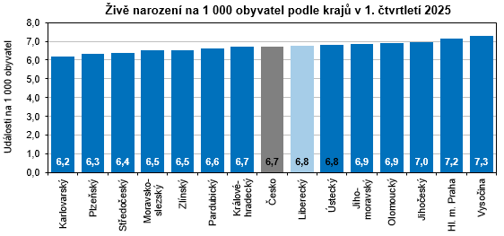 V průběhu 1. čtvrtletí 2025 se v Libereckém kraji živě narodilo 748 dětí, meziročně přišlo na svět o 97 dětí (11,5 %) méně. V přepočtu na 1 000 obyvatel kraje tak připadlo 6,8 narozených dětí, tj. 7. nejvyšší hodnota. Nejvíce dětí se z pohledu tohoto ukazatele narodilo v Kraji Vysočina (7,3 ‰), nejméně v Karlovarském kraji (6,2 ‰). V rámci Libereckého kraje bylo nejvíce živě narozených dětí evidováno v okrese Liberec (325 dětí, tj. 7,3 dětí na 1 000 obyvatel), nejméně v okrese Semily (118 dětí, tj. 6,6 ‰).